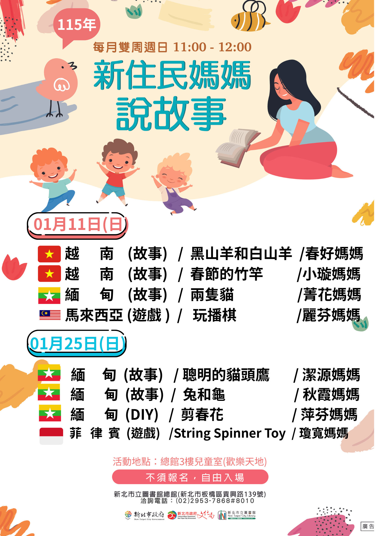 本館辦理新住民媽媽說故事活動,由來自印尼、緬甸、菲律賓、越南、柬埔寨、日本、馬來西亞、菲律賓等國家的媽媽們,分享家鄉故事外,也會不定期辦理家鄉故事劇表演,歡迎大家一起來認識多元文化。