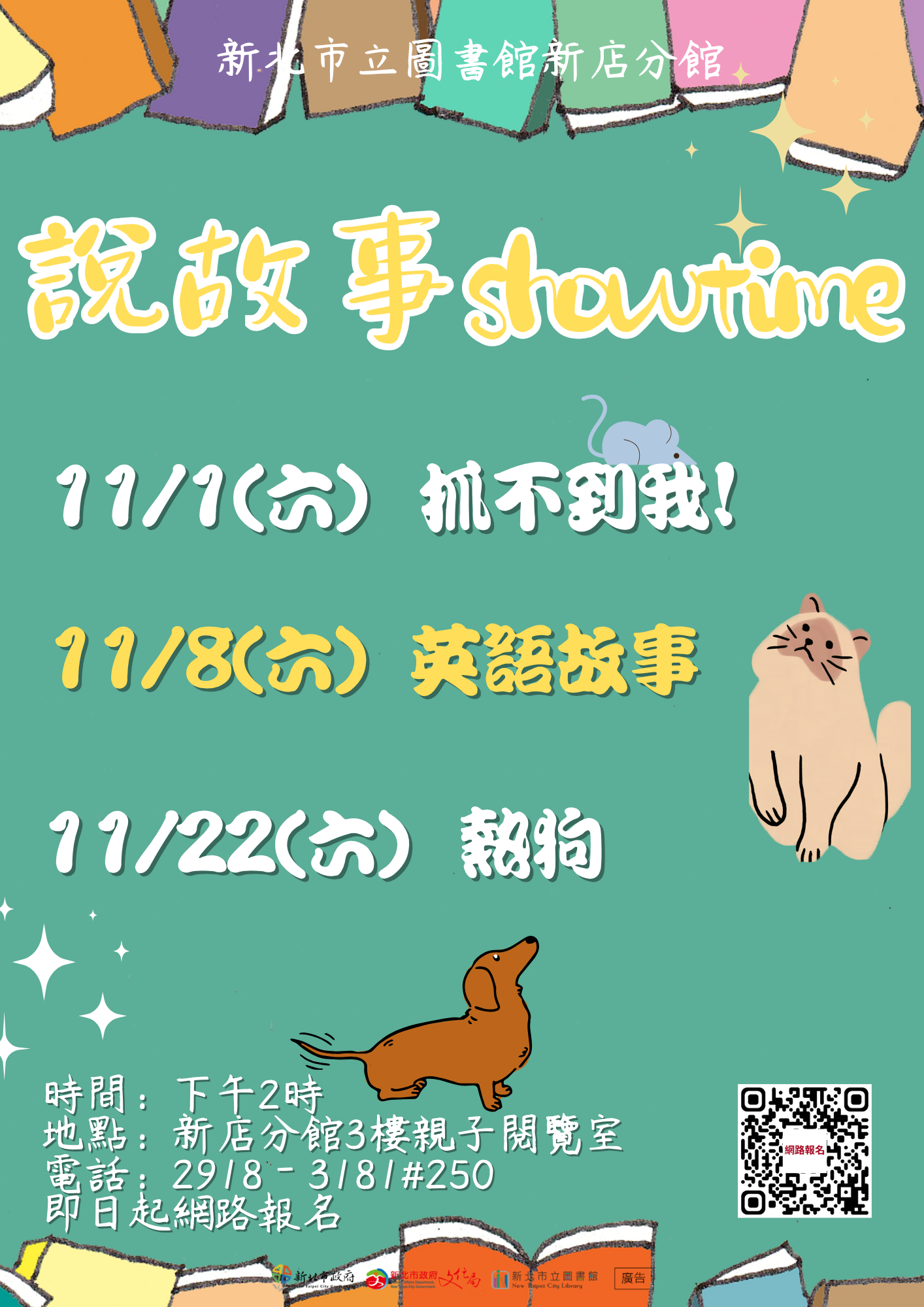 【新店分館】114年11月故事Show Time 11/1(六)14:00 抓不到我! /Vivien 老師 11/8(六)14:00 英語故事/Vozaco老師 11/22(六)14:00 熱狗/Cherry老師 *報名後,將會收到系統電子信箱回覆,代表已報名成功。 地點:新店分館3樓親子閱覽室(新北市新店區北新路3段105巷2號3樓) 報名:即日起網路報名 https://reurl.cc/LnRaGX 電話:2918-3181#25