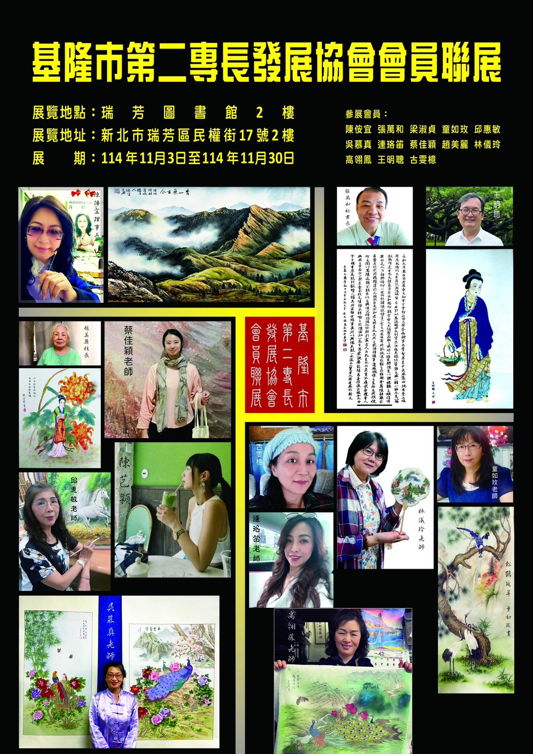 (此次宣傳海報為基隆市第二專長發展協會提供) 藝術家:基隆市第二專長發展協會會員 展覽單位:基隆市第二專長發展協會 展覽時間:即日起至11/30開館時間 展覽地點:瑞芳分館2樓展覽區 歡迎對水墨畫有興趣的朋友參與觀賞。