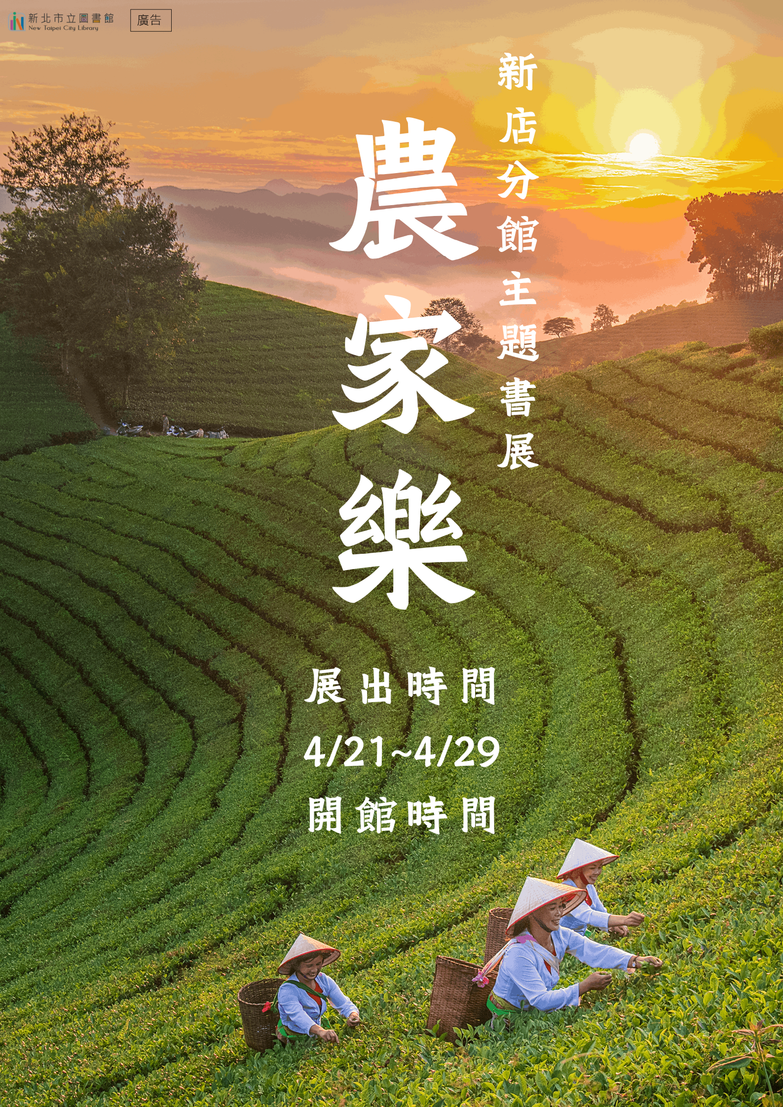 【新店分館】115年4月主題書展:農家樂 從書中認識土地,動手體驗農活,享受返璞歸真的寧靜,領略大自然最純粹的樂趣。 展出時間:4月21日至4月29日開館時間 4月30日清館日不對外開放 展出地點:新北市立圖書館新店分館主題書展區 新北市新店區北新路三段105巷2號3樓 展示期間 圖書可外借