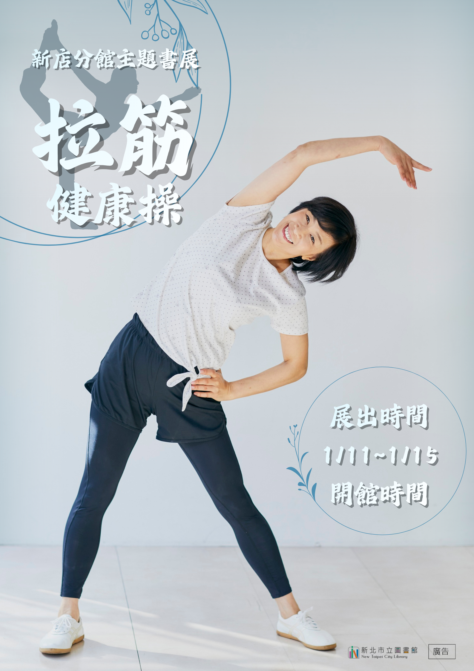【新店分館】115年1月主題書展:拉筋健康操 拉筋是一項簡單的運動,地點不限,隨時可做,全身的筋骨伸展開後, 可提升柔軟度、改善血液循環、舒緩肌肉、促進身心放鬆, 歡迎大家來書中得到對健康的幫助! 展出時間: 1月11日至1月15日開館時間 展出地點:新北市立圖書館新店分館主題書展區 新北市新店區北新路三段105巷2號3樓 書展示期間 可外借