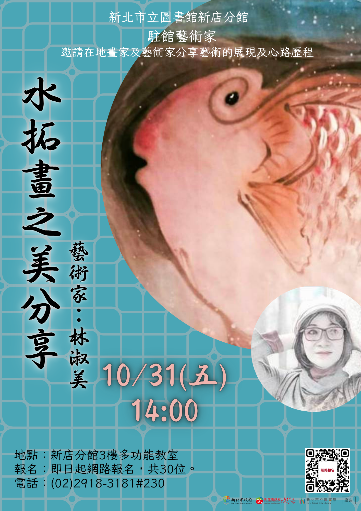 林淑美老師水拓畫展自10/1-12/31於新店分館3樓梯廳展出,歡迎觀賞。