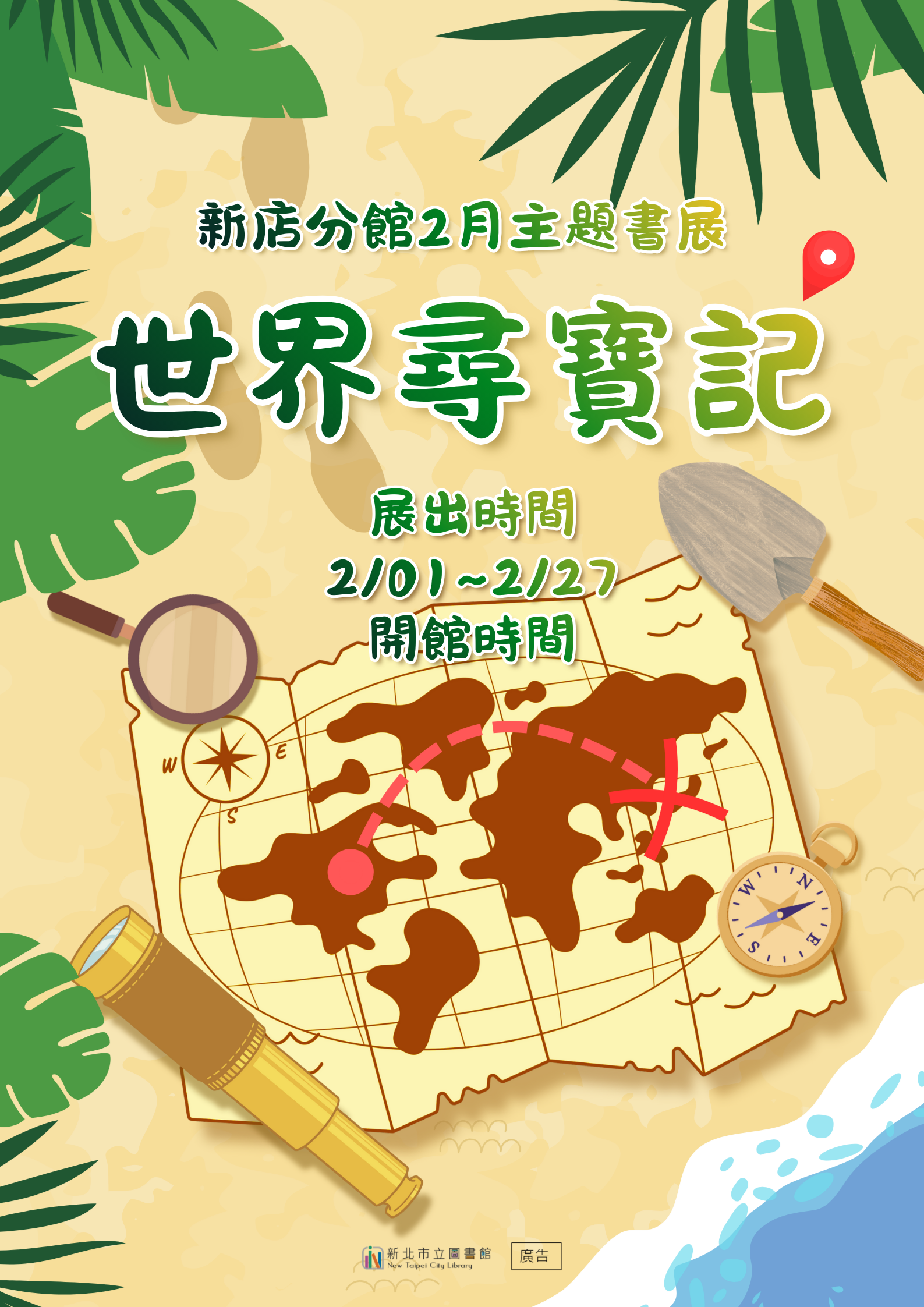 【新店分館】115年2月主題書展:世界尋寶趣 三采文化出版的尋寶趣系列遍及全世界,即使是鮮為人知的地方,透過書籍介紹也十分有趣, 趁寒假期間閱讀各地風情,行萬里路之前先讀萬卷! 展出時間:2月1日至2月27日開館時間 2月15日至2月20、26及28日 不對外開放 展出地點:新北市立圖書館新店分館青少年書展區 新北市新店區北新路三段105巷2號3樓 書展示期間 可外借