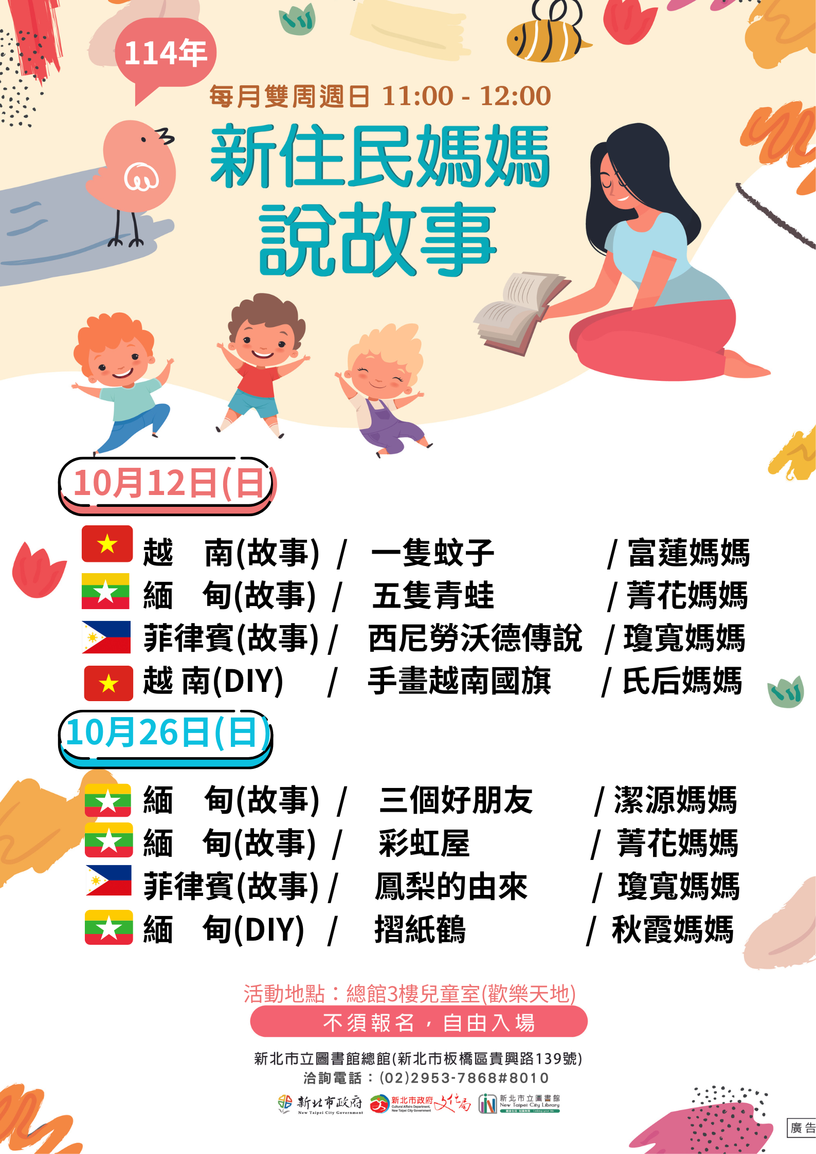 本館辦理新住民媽媽說故事活動,由來自印尼、緬甸、菲律賓、越南、柬埔寨、日本、馬來西亞、菲律賓等國家的媽媽們,分享家鄉故事外,也會不定期辦理家鄉故事劇表演,歡迎大家一起來認識多元文化。