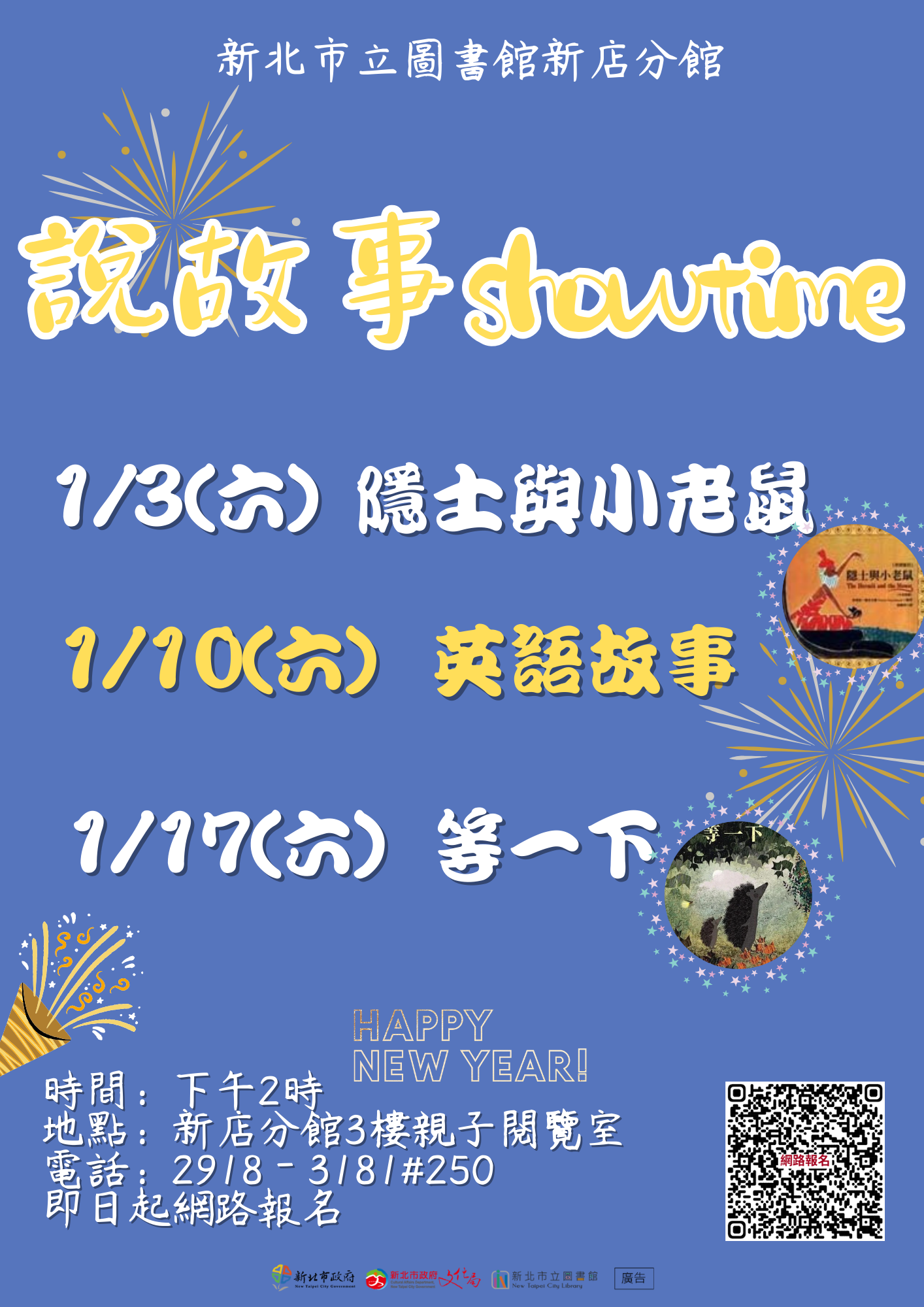 【新店分館】115年1月說故事showtime 1/3(六)14:00 隱士與小老鼠/Vivien 老師 1/10(六)14:00 英語故事/Vozaco老師 1/17(六)14:00 等一下/Cherry老師 網路報名:即日起 https://reurl.cc/aMRYrY 地點:新店分館3樓親子閱覽室(新北市新店區北新路3段105巷2號3樓) 電話:2918-3181#250