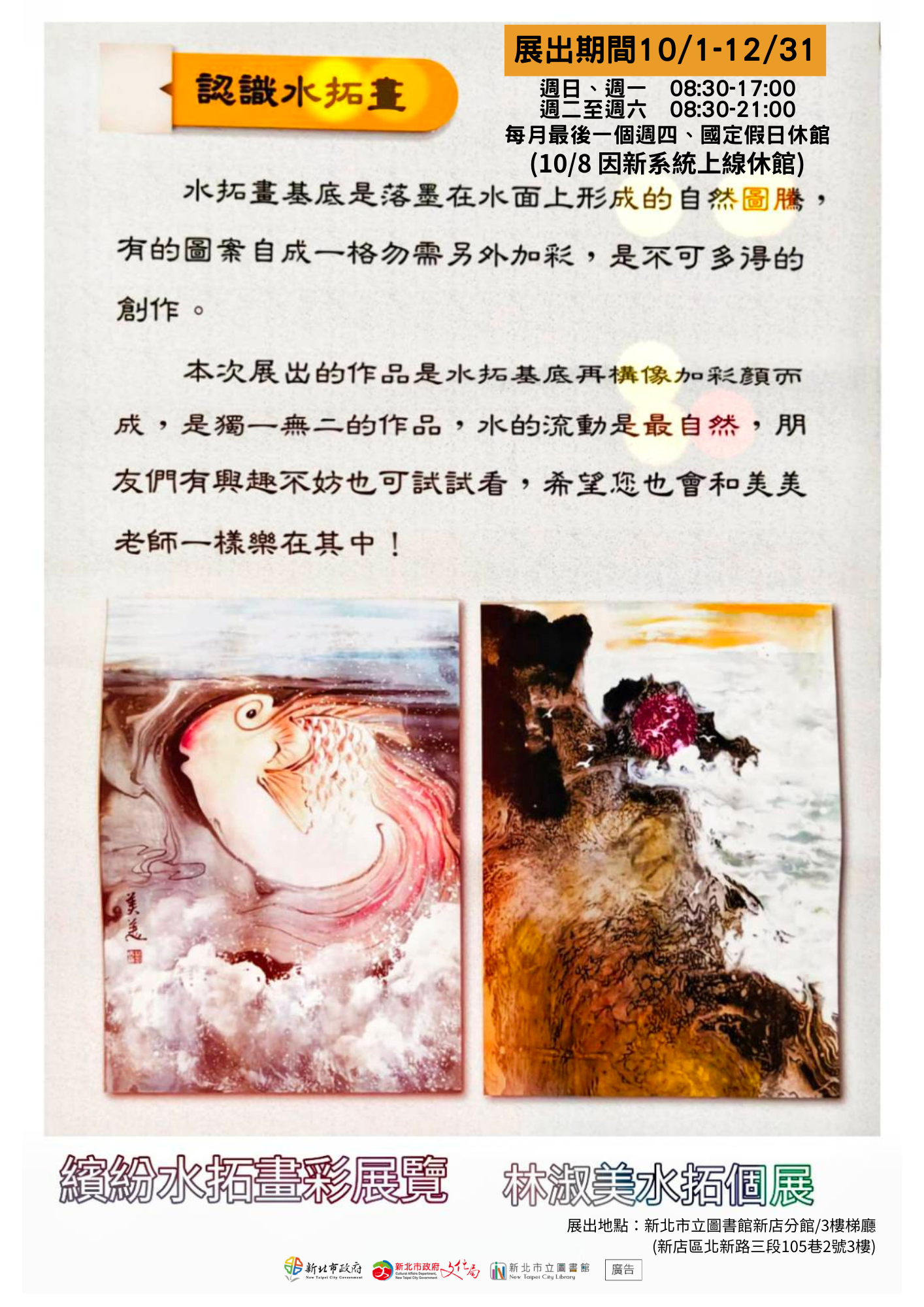 【新店分館】繽紛水拓彩畫展覽 林淑美水拓個展 水拓畫基底是落墨在水面上形成的自然圖騰, 有的圖案自然形成一格無需加彩,是不可多得的創作。 本自展出的作品是水拓基底再構像加彩顏而成,是獨一無二的作品, 水的流動是最自然,朋友們有興趣不妨也可試試看,希望您也會和美美老師一樣樂在其中! 展出時間:11/1-12/31 開館時間 展出地點:新北市立圖書館新店分館3樓梯廳 (新店區北新路三段105巷2號3樓) 連絡電話: (02)2918-3181#230或250