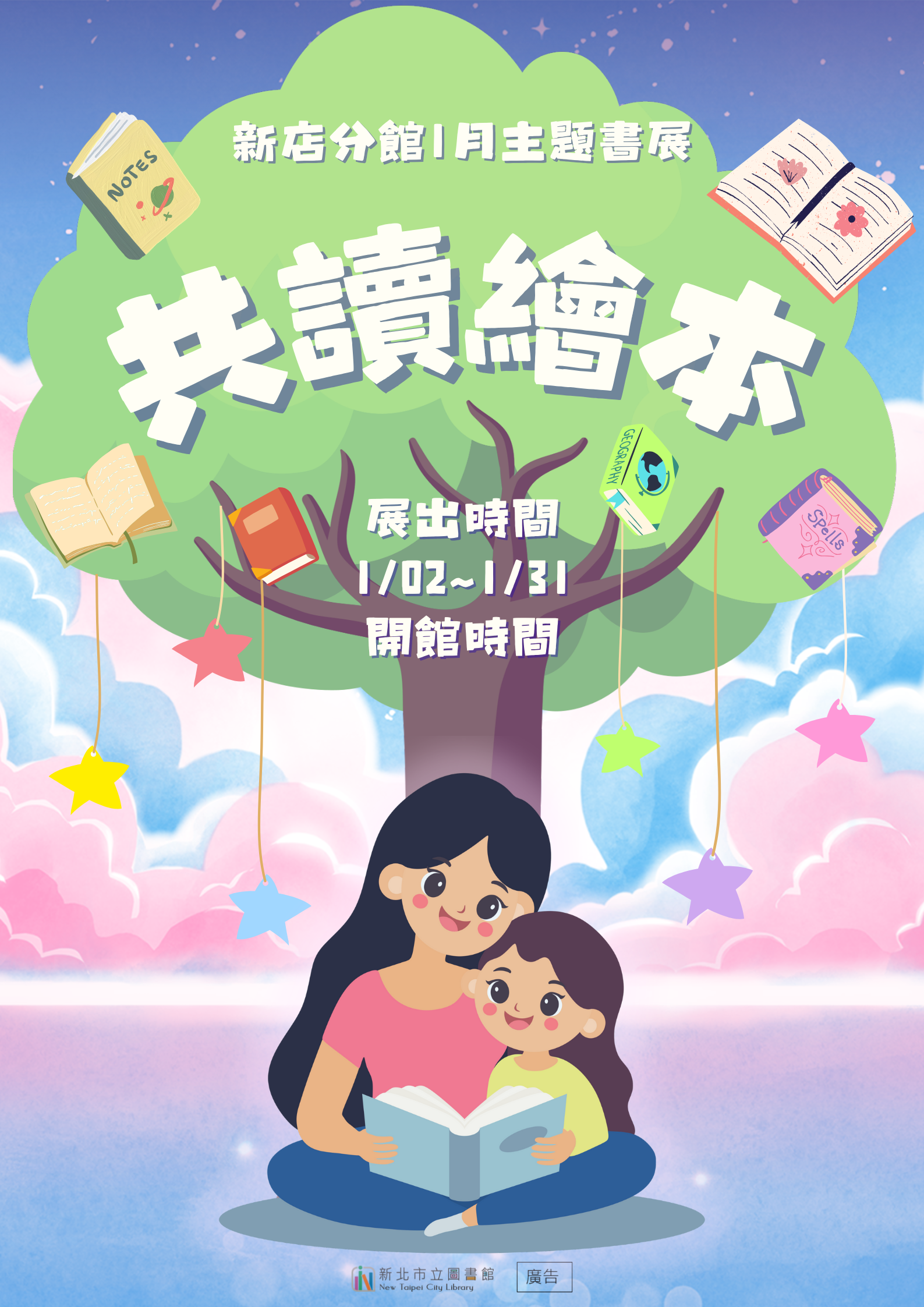 【新店分館】115年1月主題書展:共讀繪本 繪本是引領孩子閱讀的起點,在共讀繪本更是親子之間建立橋樑的好方法, 圖館館藉由繪本書展,歡迎大家一起來共讀繪本! 展出時間:1月2日至1月31日開館時間 1月29日 清館日不對外開放 展出地點:新北市立圖書館新店分館青少年書展區 新北市新店區北新路三段105巷2號3樓 書展示期間 可外借