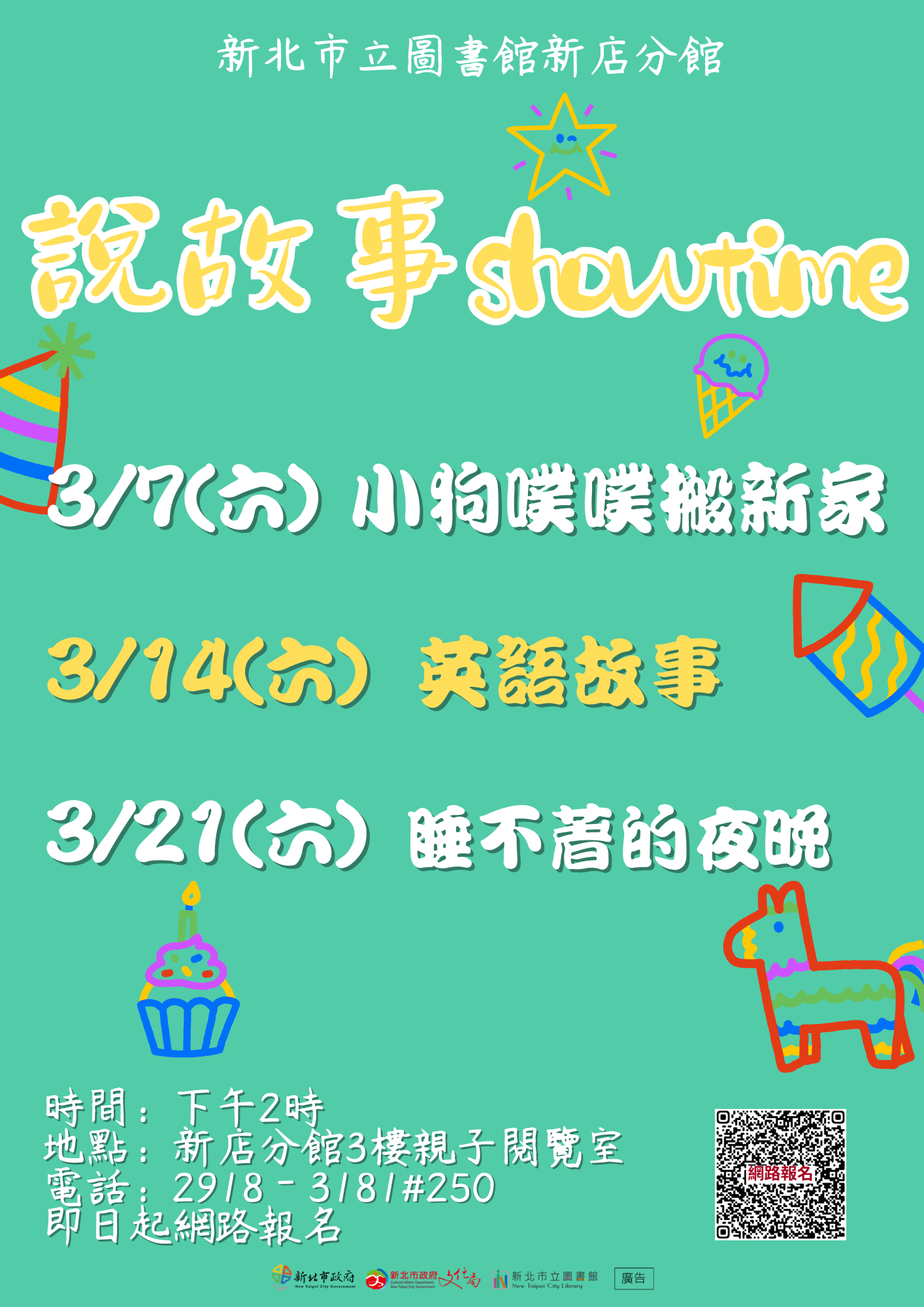 【新店分館】115年3月說故事showtime 3/7(六)14:00 小狗噗噗搬新家/Vivien 老師 3/14(六)14:00 英語故事/Vozaco老師 3/21(六)14:00 睡不著的夜晚/Cherry老師 報名網址:https://reurl.cc/LQR504 地點:新店分館3樓親子閱覽室(新北市新店區北新路3段105巷2號3樓) 電話:2918-3181#250