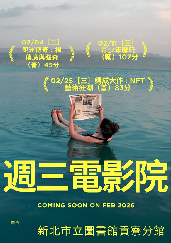 02/04[三]奧運傳奇 : 楊傳廣與強森(普)45分 02/11[三]青少年哪吒(輔)107分 02/25[三]鑄成大作 : NFT藝術狂潮(普)83分 *播放影片與時間若有更動,以活動現場公告為主。 *敬請各位觀眾遵守電影分級制度。 *免費入場,無須報名,禁止飲食。 ~☆歡迎闔家蒞臨觀賞☆~