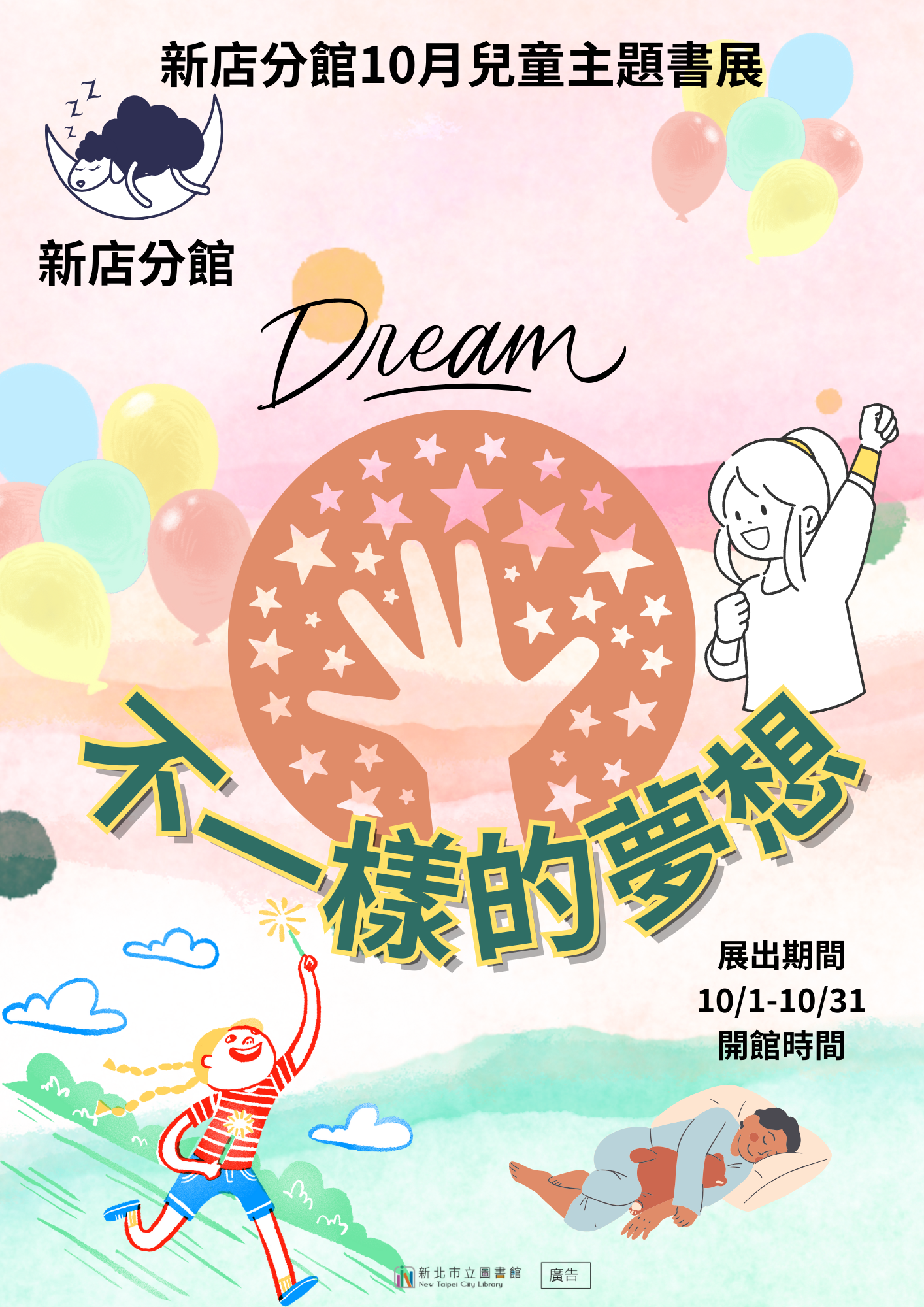 【新店分館】114年10月主題書展:不一樣的夢想 想讓人活出有目標和方向的生命,夢想更是人類才有的想法, 有夢想將使生命再一樣,讓孩子發覺自己的夢想, 活出色彩! 展出時間:10月1日至10月31日 開館時間 10月6、8、10及30日 不對外開放 展出地點:新北市立圖書館新店分館青少年書展區 新北市新店區北新路三段105巷2號3樓 書展示期間 可外借