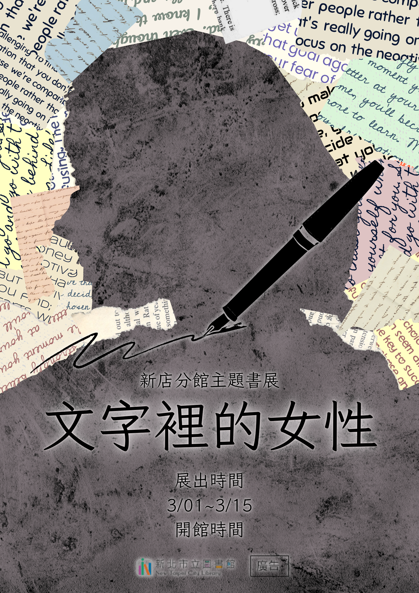 【新店分館】115年3月主題書展:文字裡的女性 你是否曾經留意過,故事中的女性可以是溫柔婉約的、可以是正直勇敢的,也可以是獨立自主的 透過文字就能發現其中充滿著多元的魅力,一起來探索她們的故事吧! 展出時間:3月1日至3月31日開館時間 3月26日 清館日不對外開放 展出地點:新北市立圖書館新店分館主題書展區 新北市新店區北新路三段105巷2號3樓 書展示期間 可外借