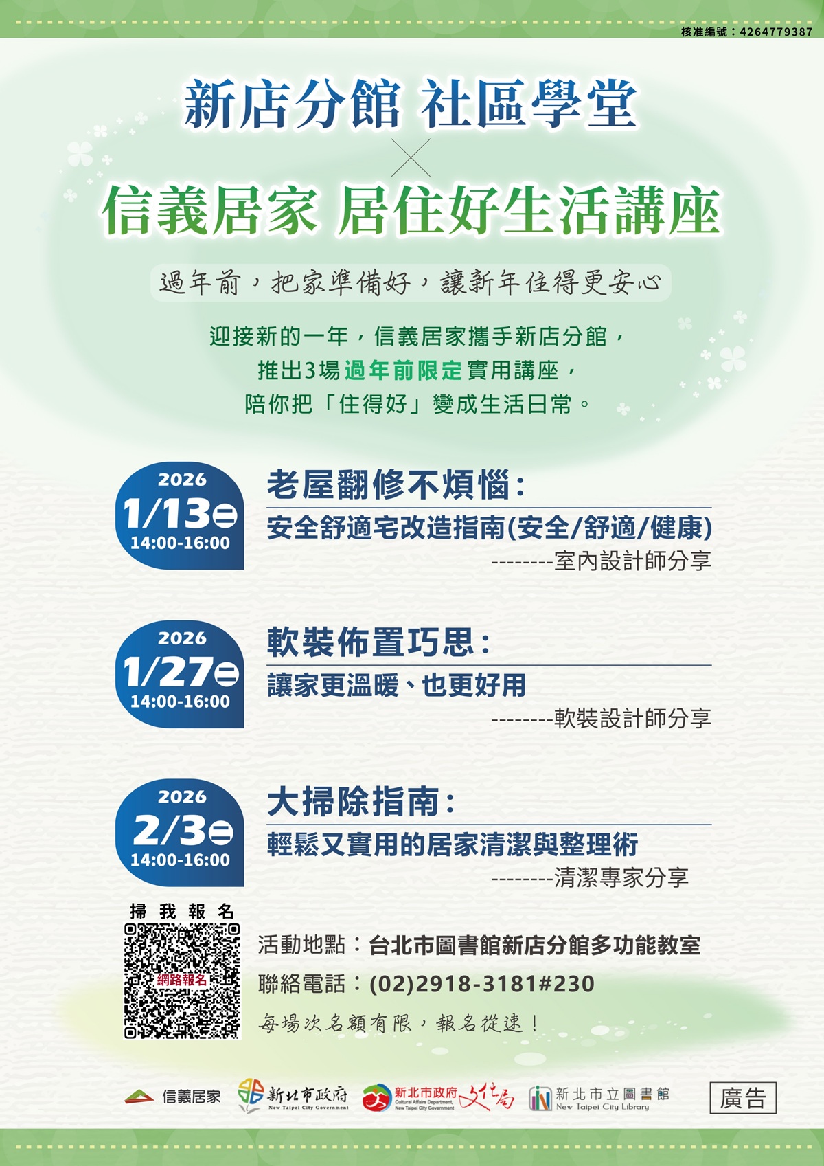 新春將近,新店分館與信義居家公益合作,邀請您認識透過老屋翻修、室內軟裝布置及居家清潔,帶您年末大掃除!