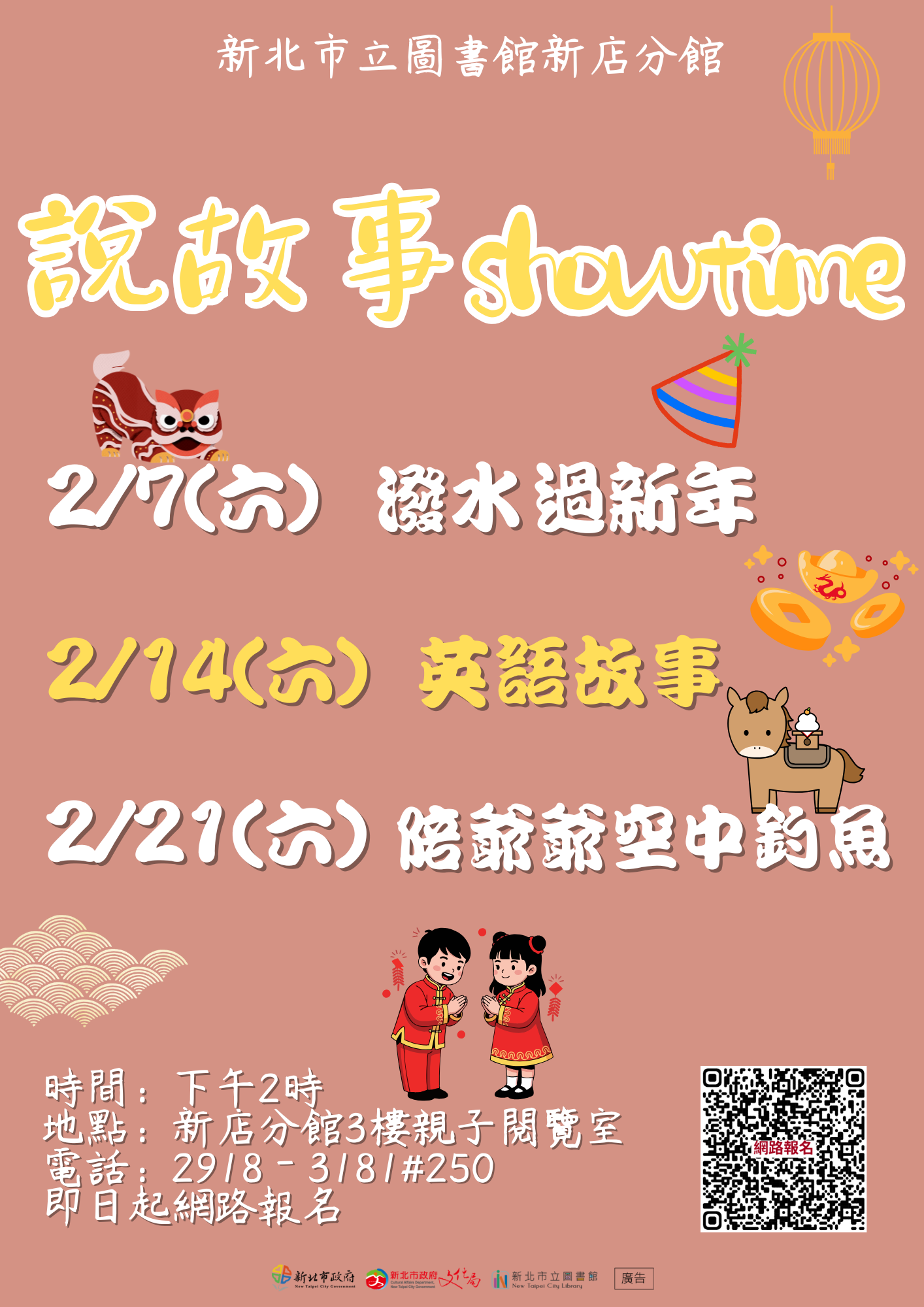 【新店分館】115年2月說故事showtime 2/7(六)14:00 潑水過新年/Vivien 老師 2/14(六)14:00 英語故事/Vozaco老師 2/21(六)14:00 陪爺爺空中釣魚/Cherry老師 報名網址: https://reurl.cc/QVAjX9 地點:新店分館3樓親子閱覽室(新北市新店區北新路3段105巷2號3樓) 電話:2918-3181#250