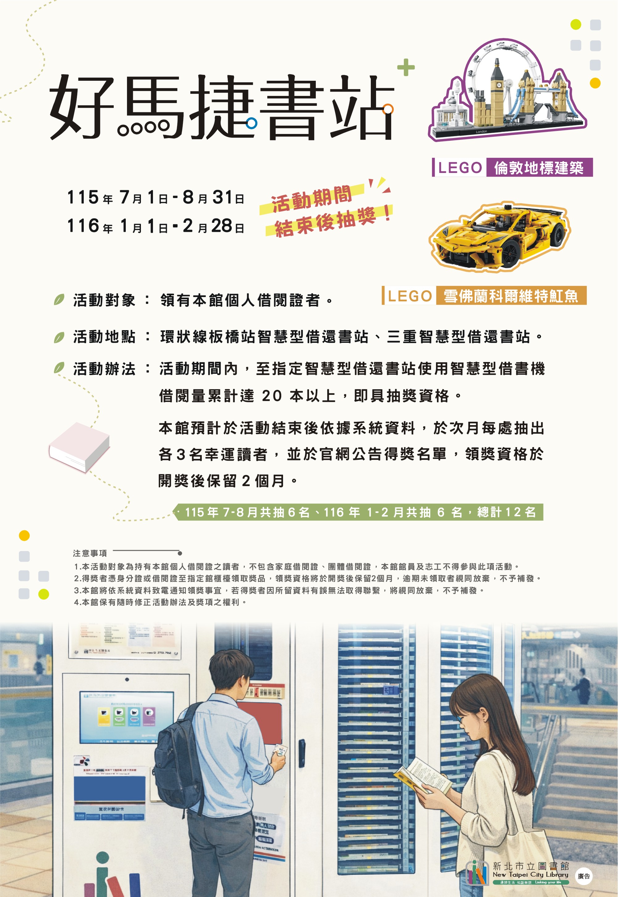 2. 本館預計於活動結束後依據系統資料,於次月每處抽出各3名幸運讀者(115年7月至8月共抽 6名、116年1月至2月共抽6名),總計12名,在官網公告得獎名單,領獎資格於開獎後保留2個月。
