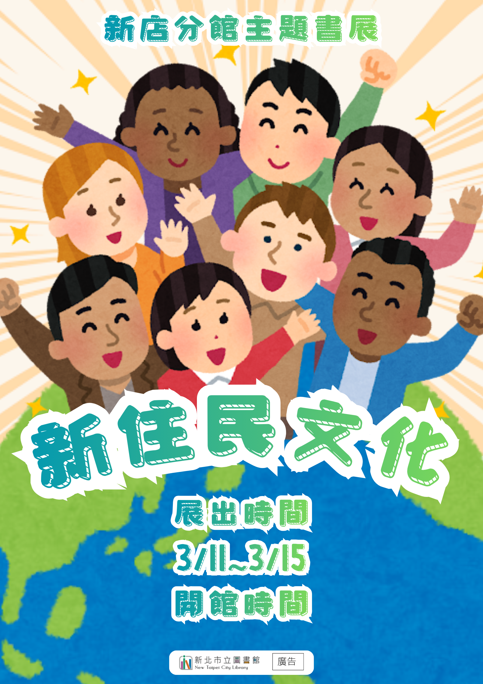 【新店分館】115年3月主題書展:新住民文化 來自世界各地的新住民,為社會注入了鮮明的色彩和風俗習慣 藉由本次主題書展帶領大家認識多元的社會脈絡及文化背景 展出時間:3月11日至3月15日開館時間 3月26日清館日不對外開放 展出地點:新北市立圖書館新店分館主題書展區 新北市新店區北新路三段105巷2號3樓 展示期間 圖書可外借