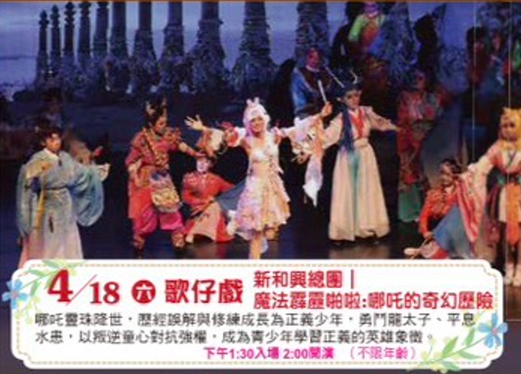《4月表演活動 : 新和興總團 -魔法霹靂啪啦-哪吒的奇幻歷險》 時間 :4/18(六)下午13:30入場 14:00演出 地點 :淡水分館演藝廳(淡水區文化路65號) 電話 :02-2622-4664分機221 簡介: 《魔法霹靂啪啦:哪吒的奇幻歷險》是由新和興總團所推出的親子互動歌仔戲。結合傳統哪吒(三太子)的神話故事,加入現代奇幻與魔法元素,轉化為適合兒童觀賞的冒險故事。 備註: 無須索票,免費入場; 演出長度90分鐘(無中場休息)。