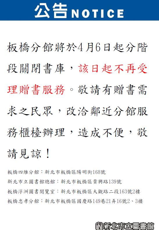 【板橋分館】將於4月6日起分階段關閉書庫,該日起不再受理贈書服務。 【板橋分館】將於4月6日起分階段關閉書庫,該日起不再受理贈書服務。敬請有贈書需求之民眾,改洽鄰近分館服務櫃檯辦理,造成不便,敬請見諒! ※新北市立圖書館板橋四維分館:新北市板橋區陽明街168號 ※新北市立圖書館總館:新北市板橋區貴興路139號 ※新北市立圖書館板橋浮洲圖書閱覽室:新北市板橋區大觀路二段163號2樓 ※新北市立圖書館板橋忠孝分館:新北市板橋區國慶路149巷21弄16號2、3樓