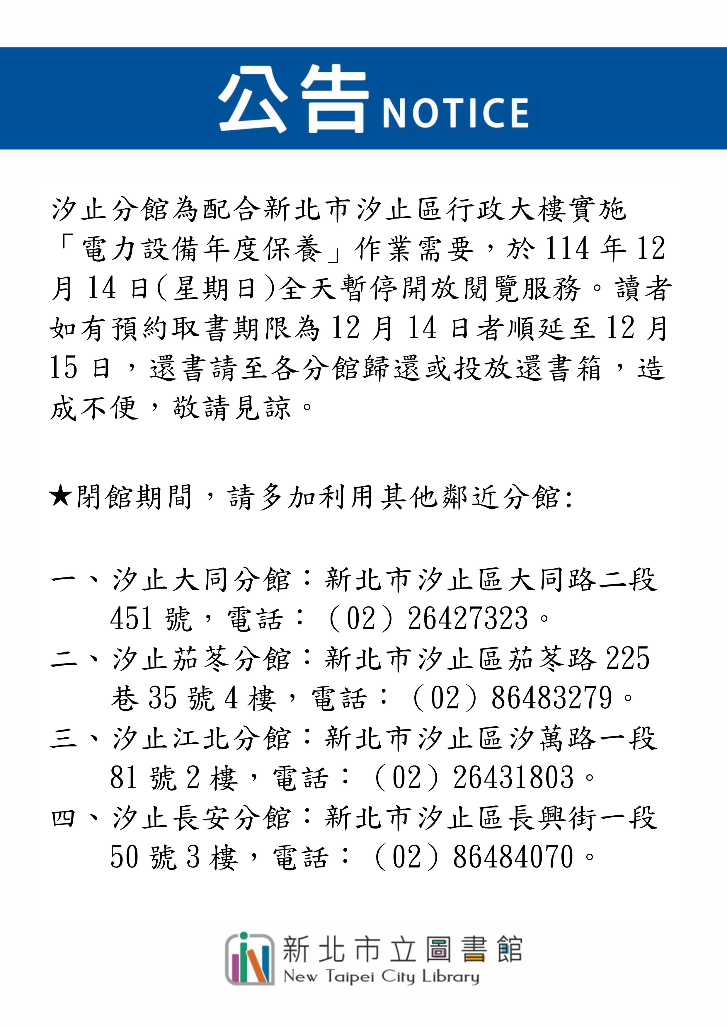 汐止分館為配合新北市汐止區行政大樓實施「電力設備年度保養」作業需要,於114年12月14日(星期日)全天暫停開放閱覽服務。讀者如有預約取書期限為12月14日者順延至12月15日,還書請至各分館歸還或投放還書箱,造成不便,敬請見諒。